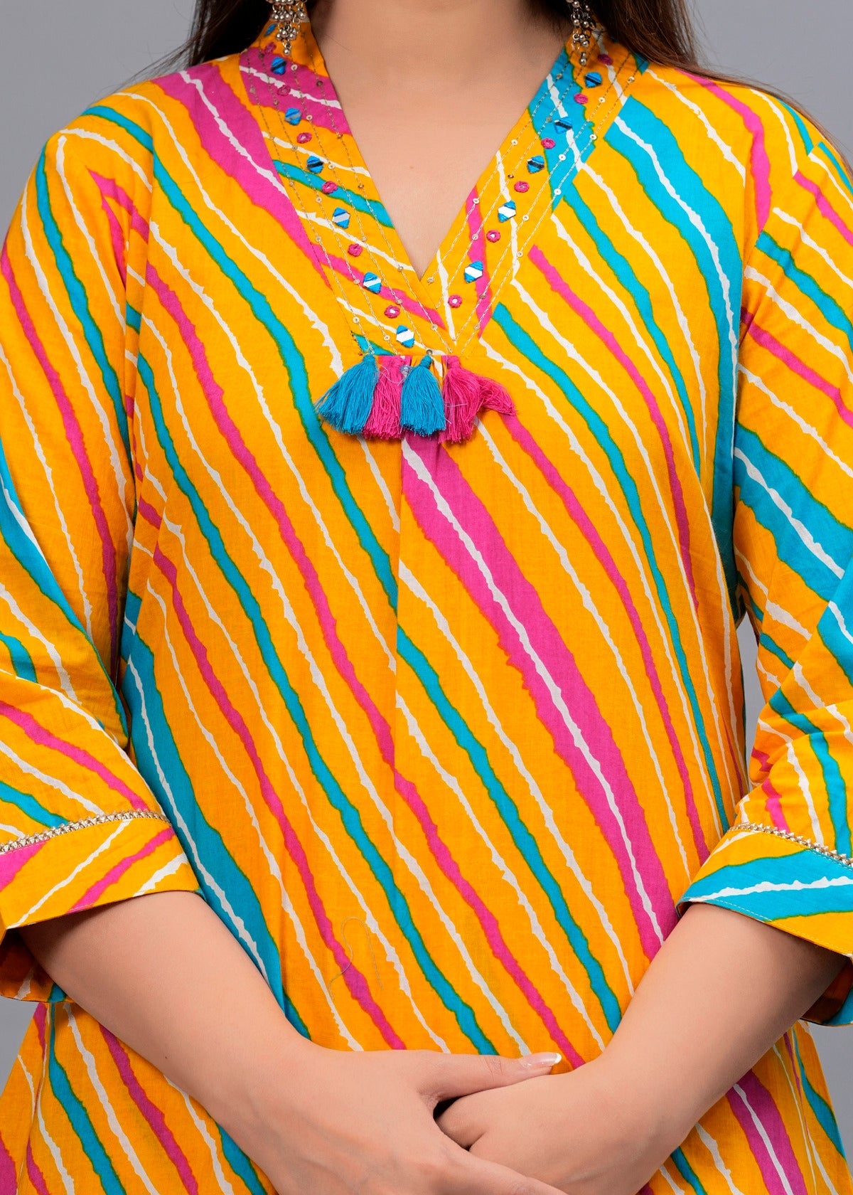 Multicolor straight calf length leheriya printed kurta, has mirror work yoke, three-quarter regular sleeves, and straight hem.