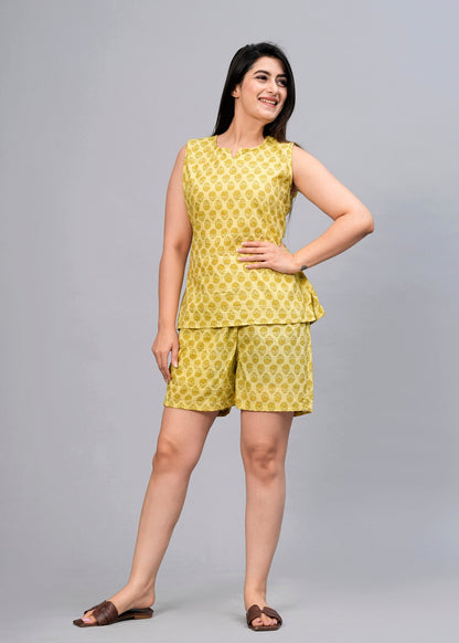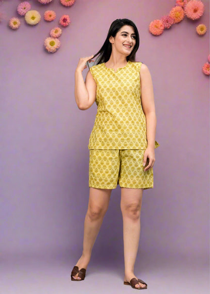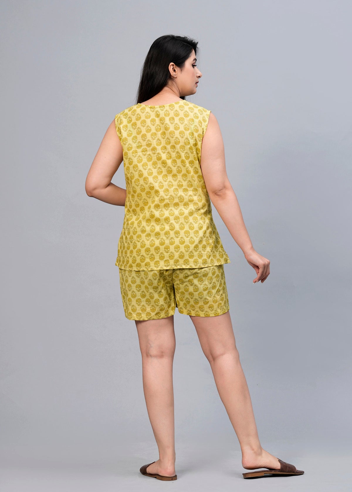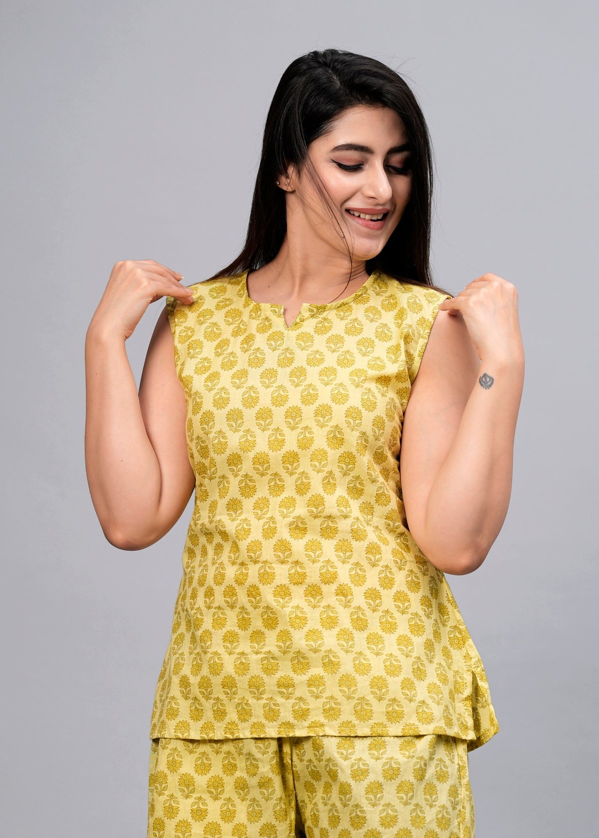 Look stylish even when you're off to bed by wearing this chic night suit. It flaunts an attractive round neck with sleeveless for enhanced appeal. This chic set is comfortable as well as feminine, making it a perfect wear for a relaxed evening at home. Club those fluffy room slippers with this one to soak in a chill vibe.You can simply unfurl yourself into the embrace of this night suit to unwind after a long day at work. This one is crafted with the softest fabric to leave you feeling light and airy.