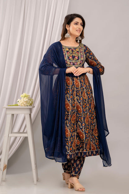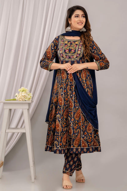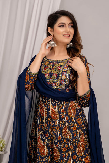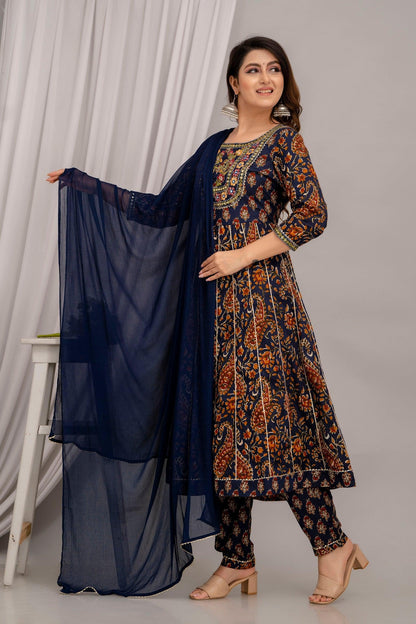 Women Navy Blue Floral Embroidered Anarkali Kurta with Trousers & Dupatta