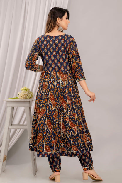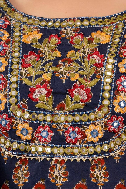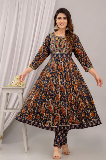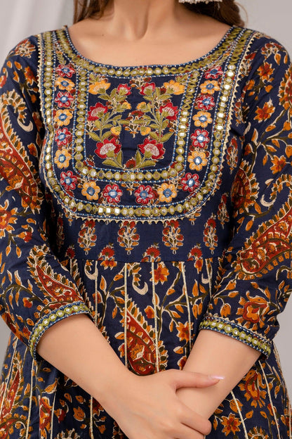 Navy blue Anarkali calf length floral printed kurta, has a embroidered yoke, three-quarter regular sleeves, gotta detailing and flared hem.