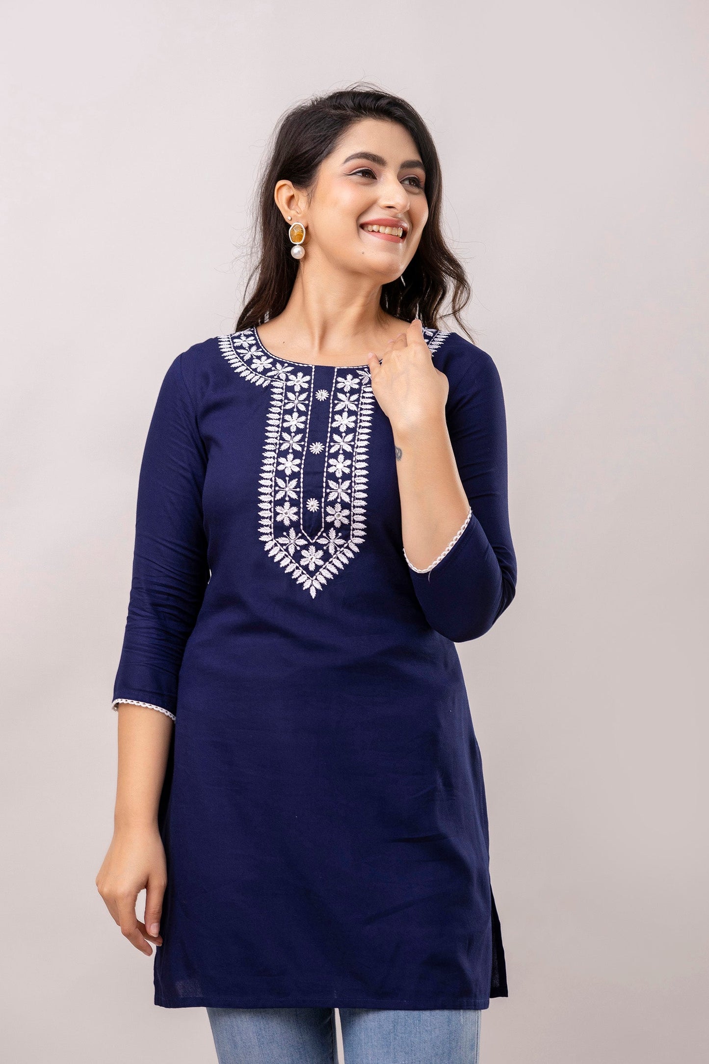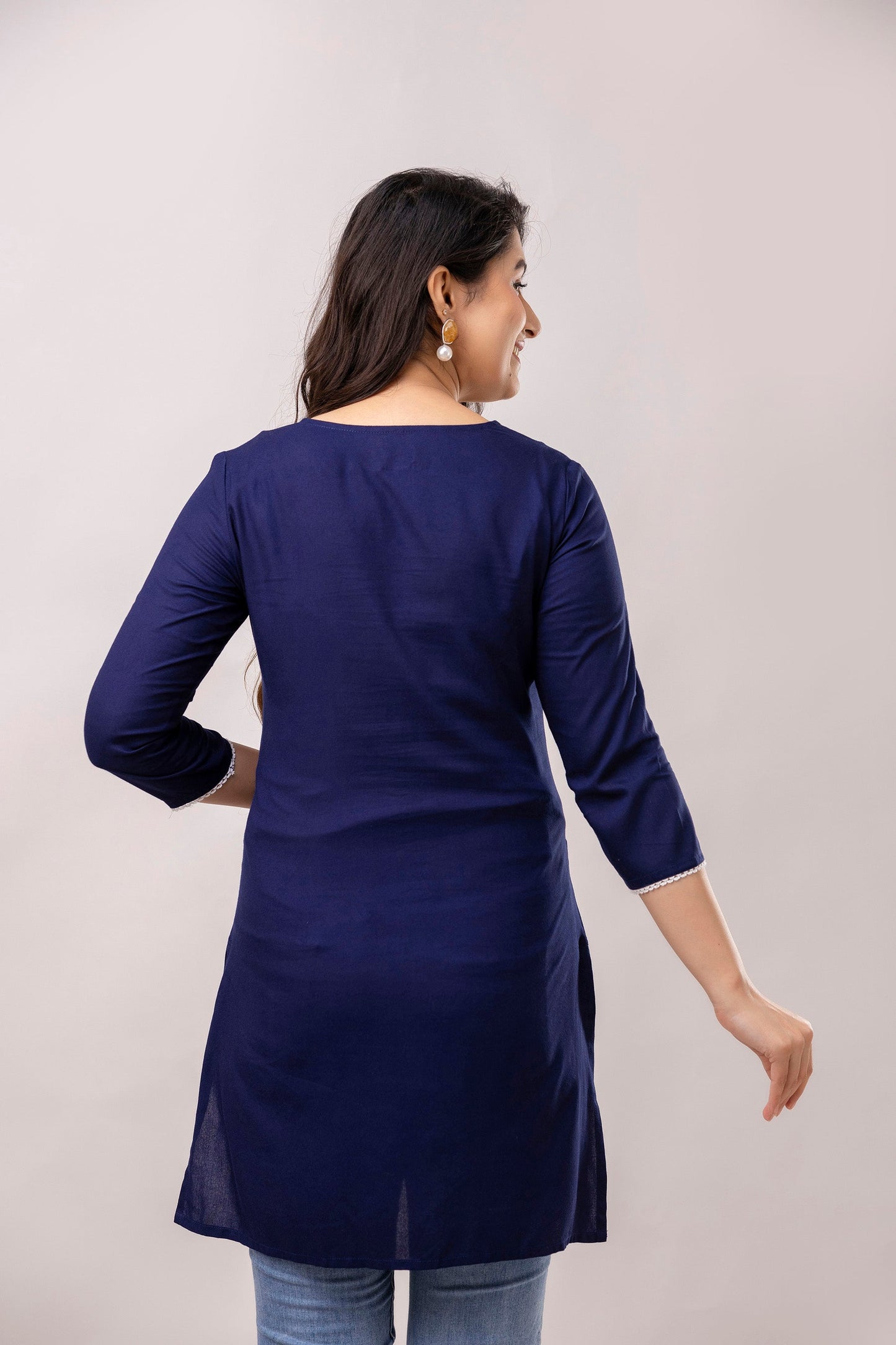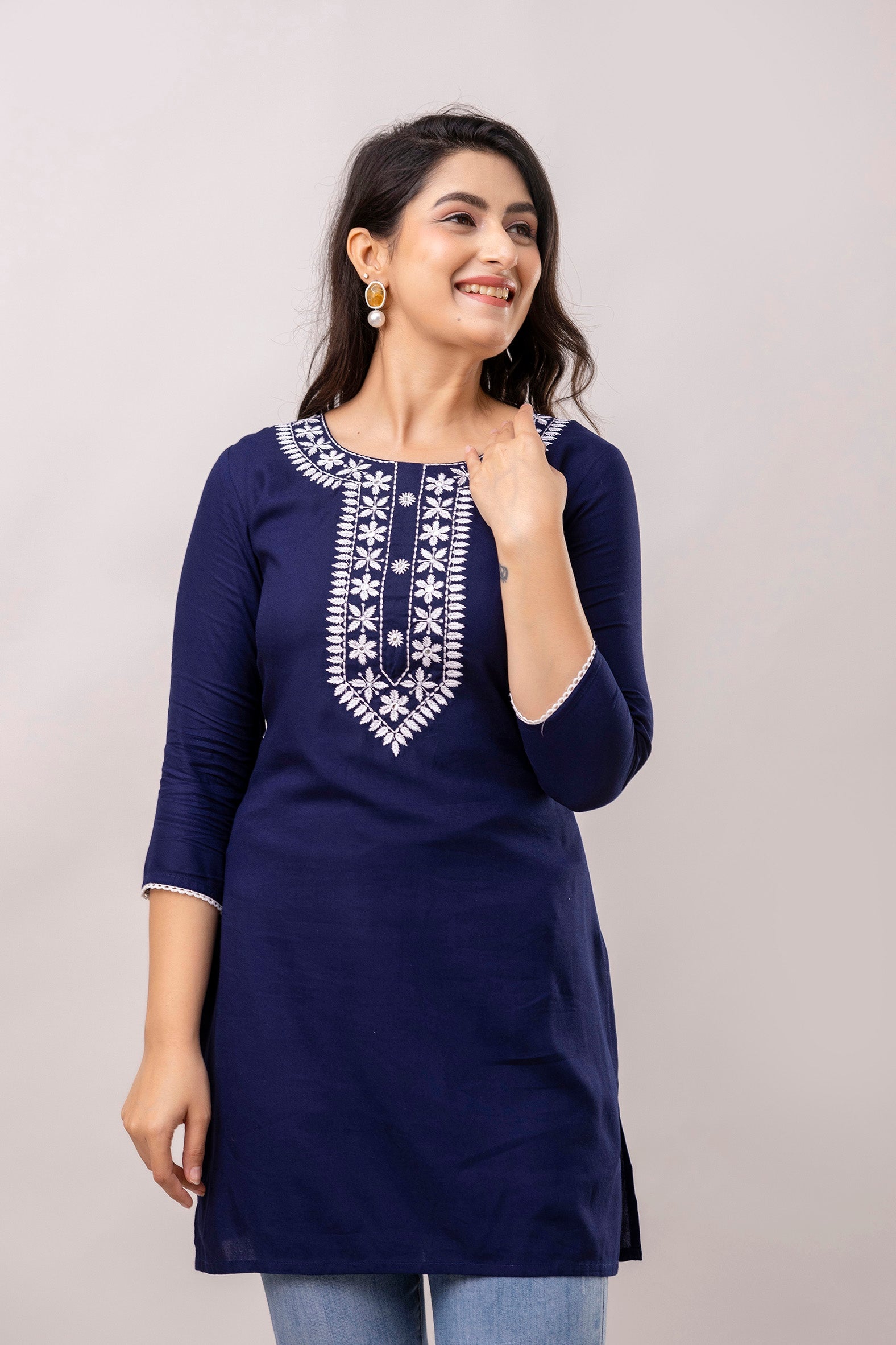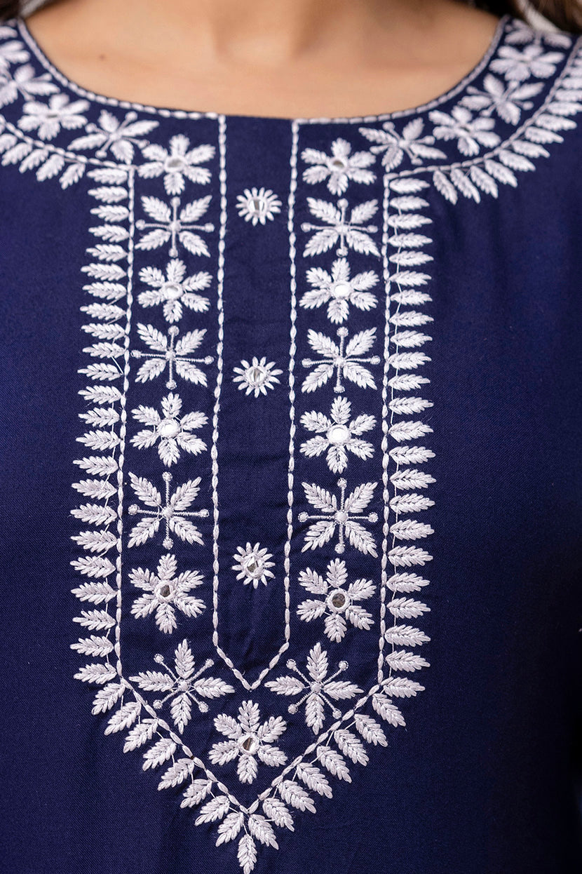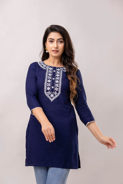 Navy blue and white chawal taka embroidered straight kurti, has a round round neck, three-quarter sleeves, straight hem with side slits.