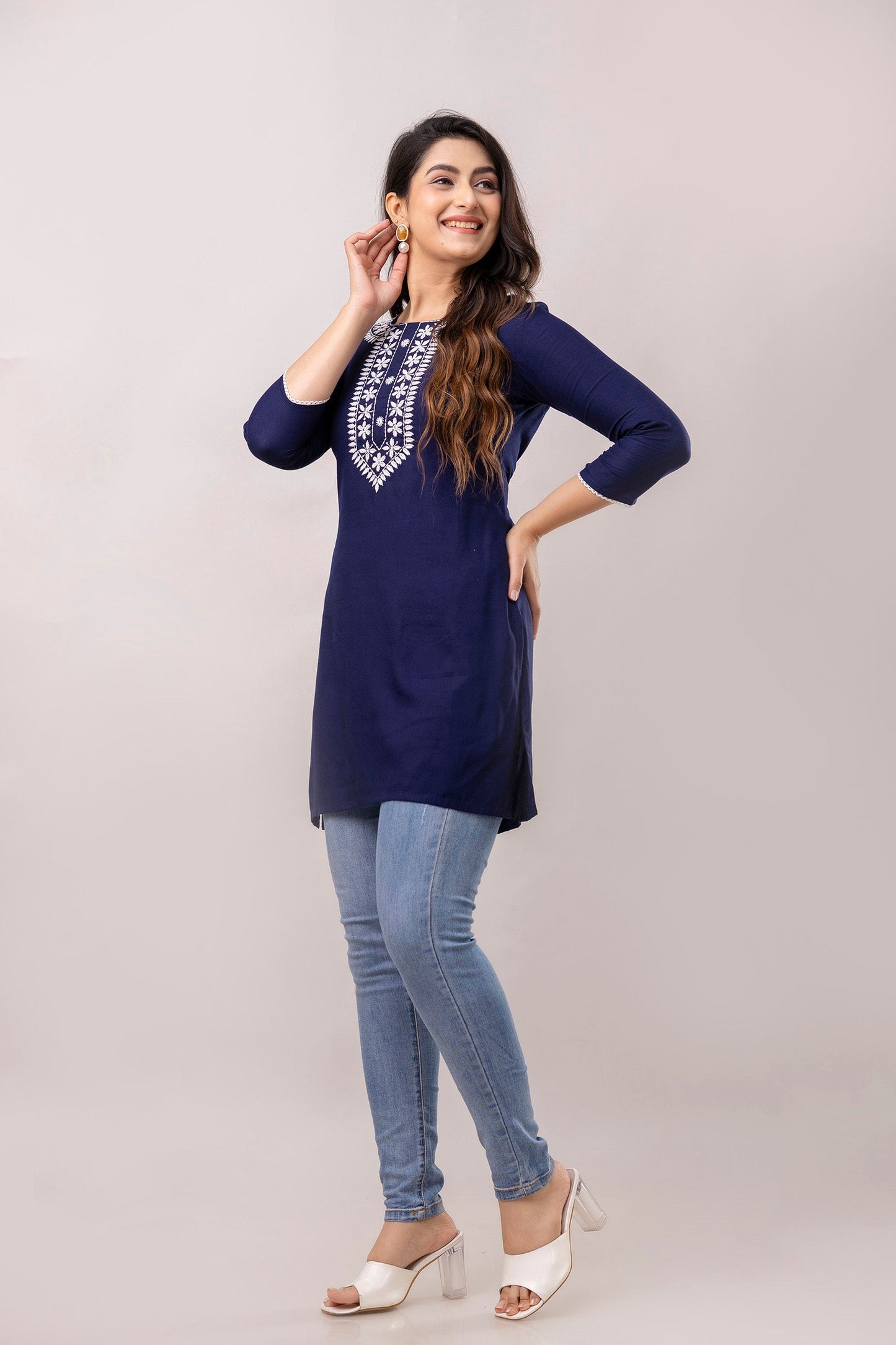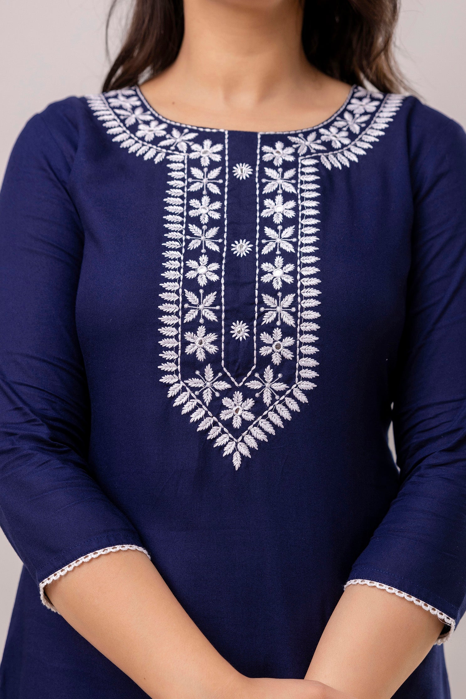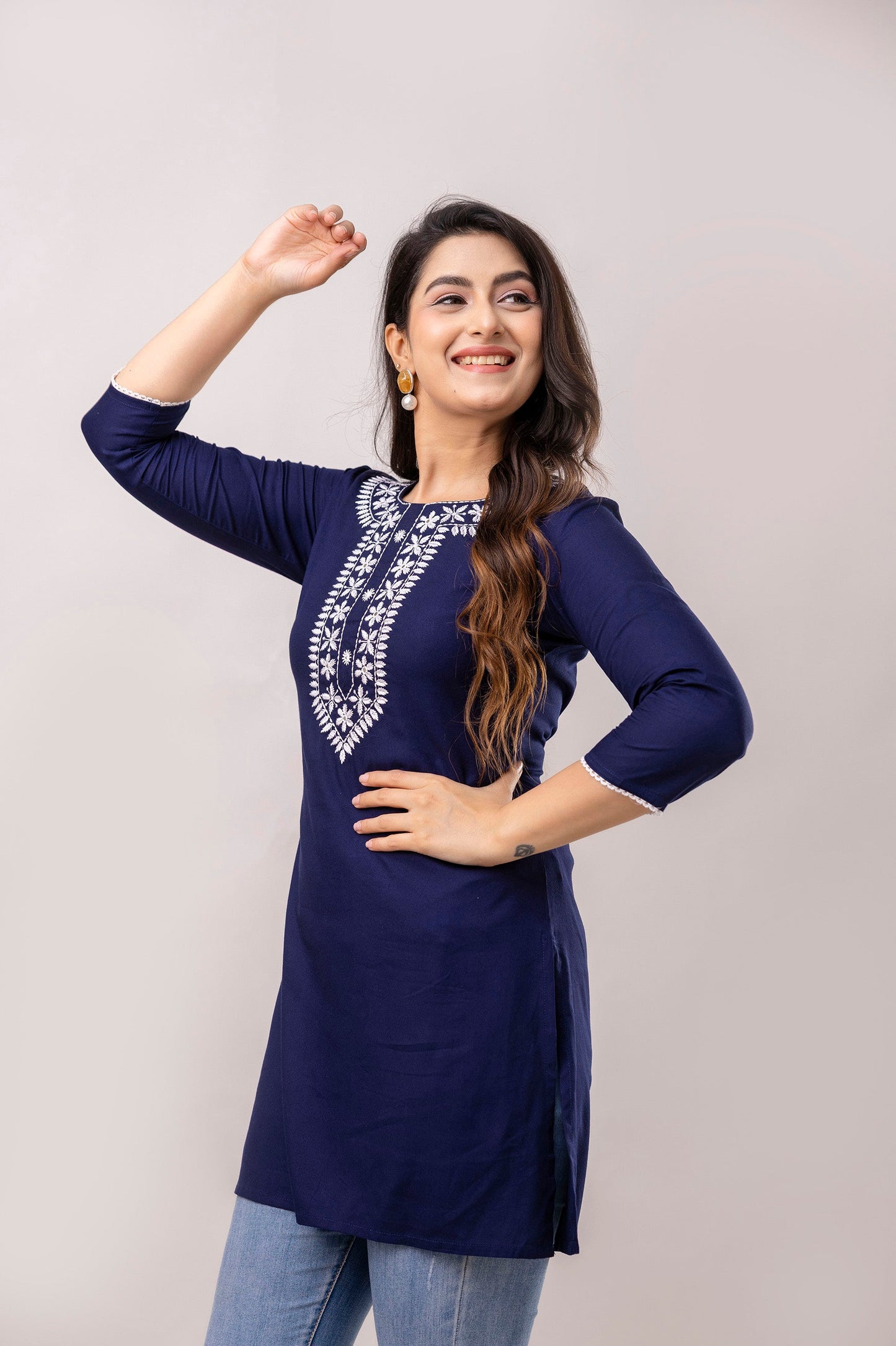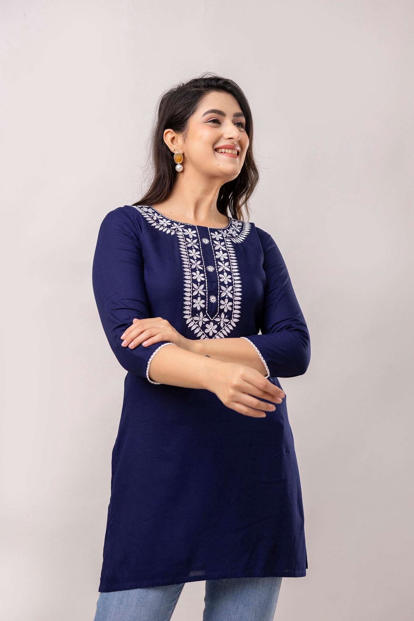 Navy blue and white chawal taka embroidered straight kurti, has a round round neck, three-quarter sleeves, straight hem with side slits.