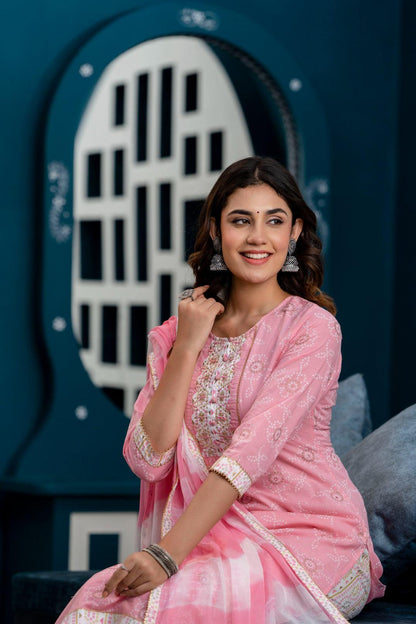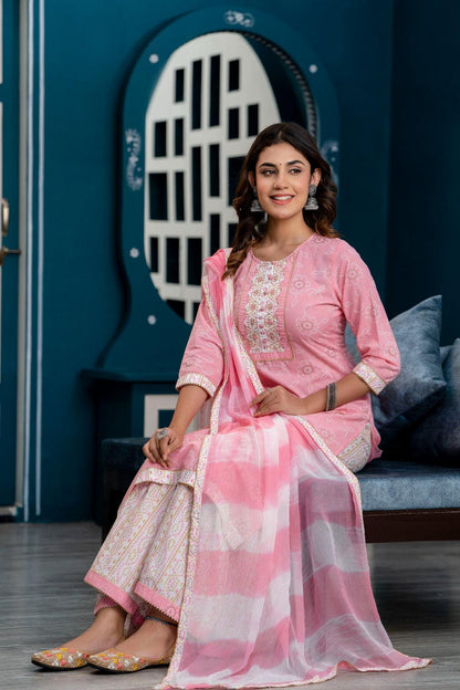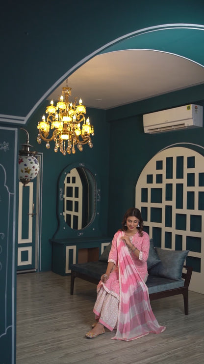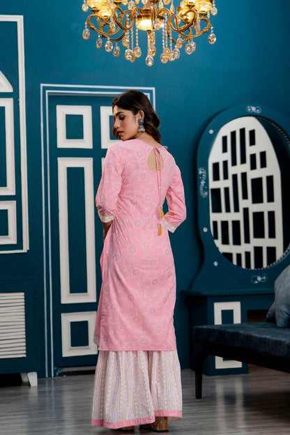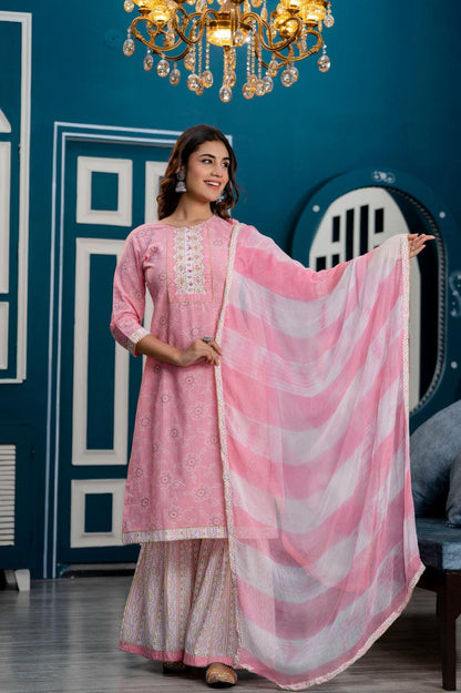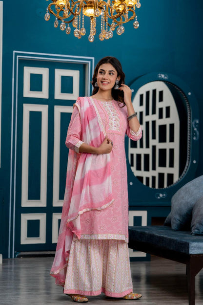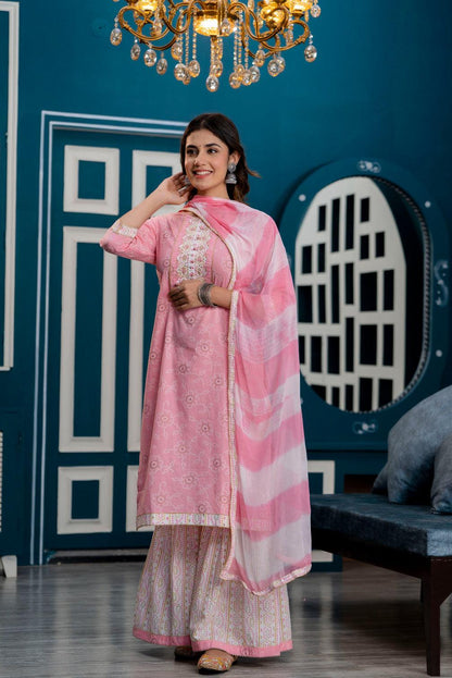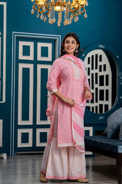 Women Pink Bandhani Printed Kurta with Sharara & Dupatta