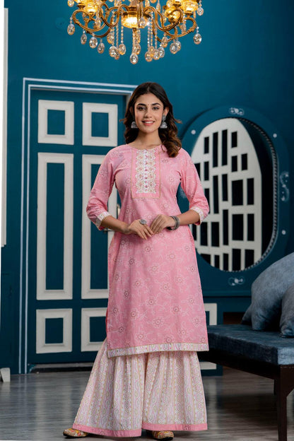 Pink Printed sharara, has partially elasticated waistband and slip-on closure.