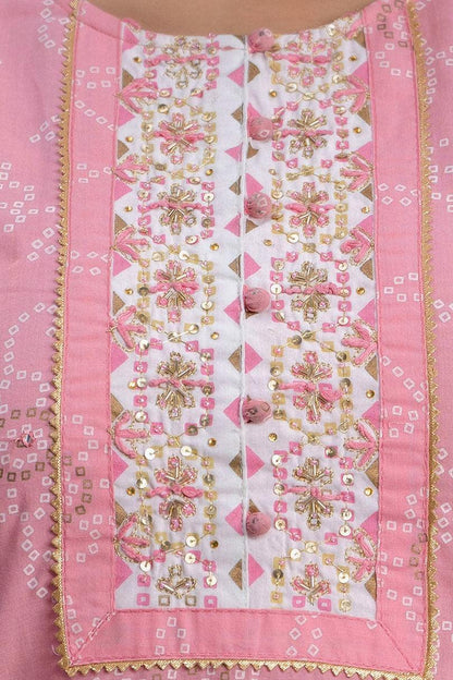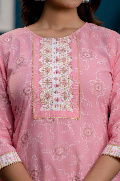 Pink straight calf length bandhani printed kurta, has a designer patch work yoke, three-quarter regular sleeves, side slits and straight hem.