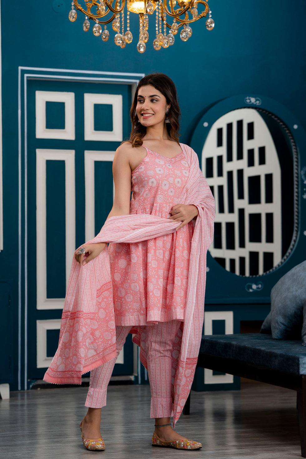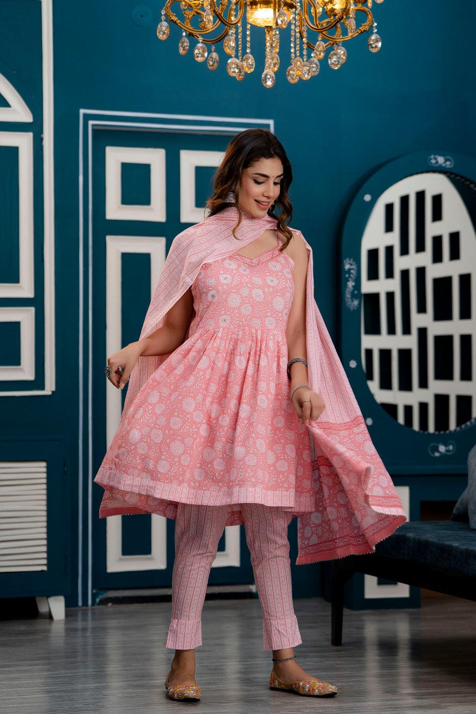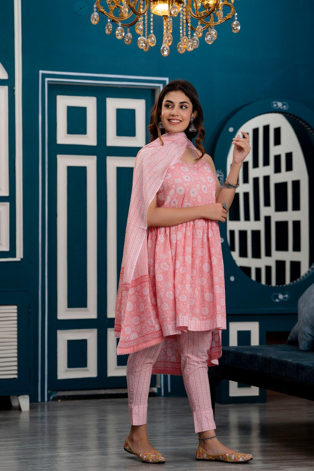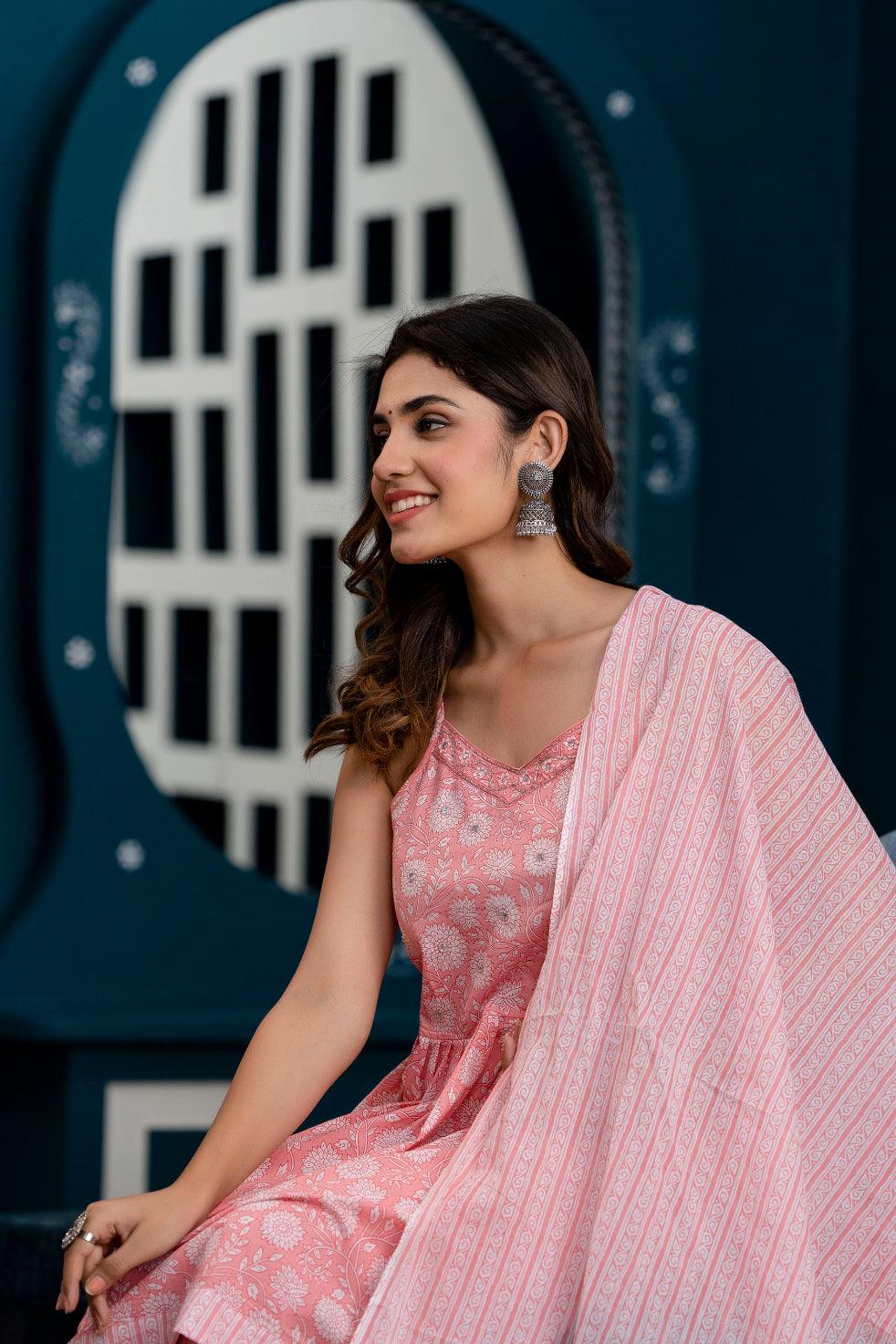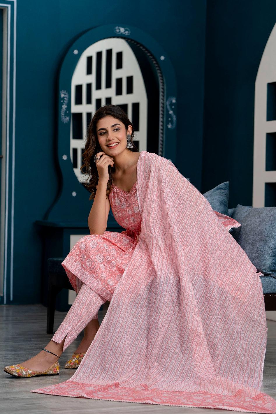 Pink floral printed kurta with trousers & dupatta