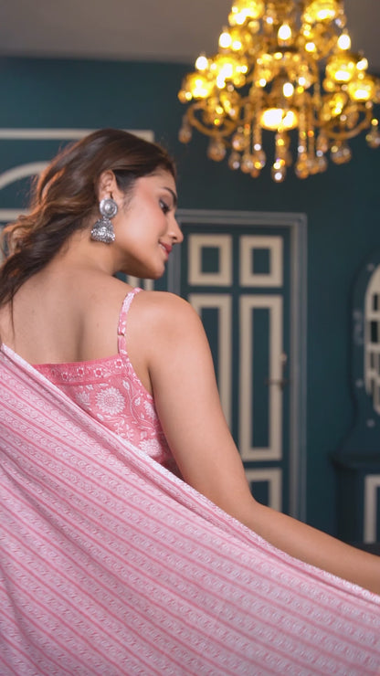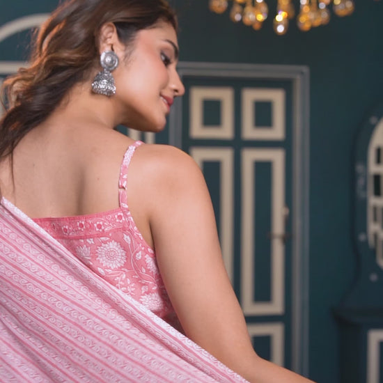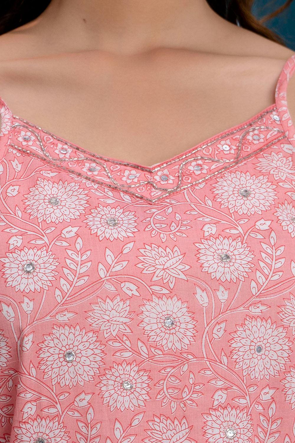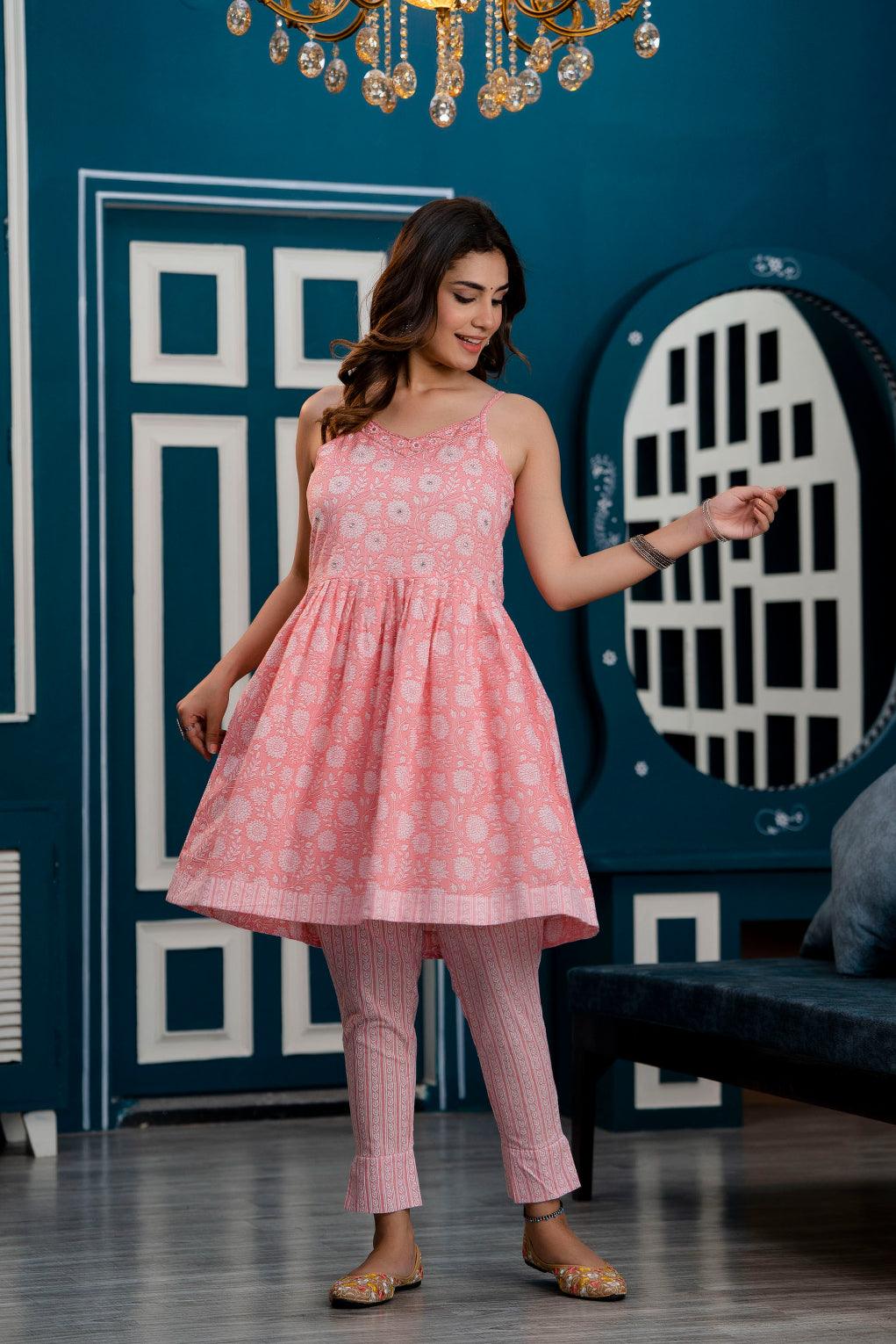 PInk flared mid-thigh length kurta, has a V neck, sleeveless, flared hem, shoulder straps and has sequinned detailing
