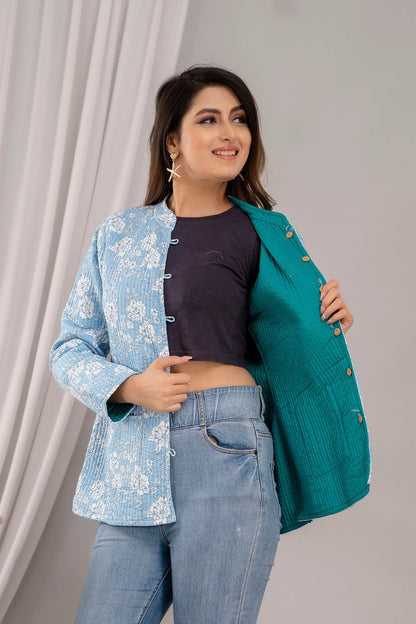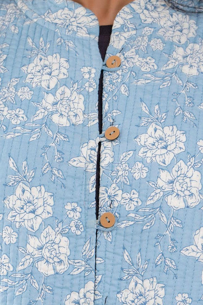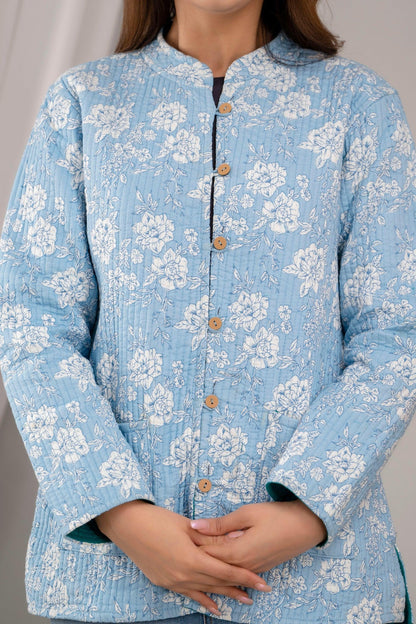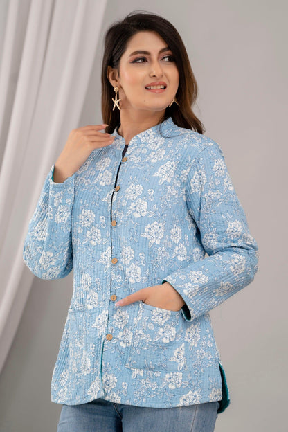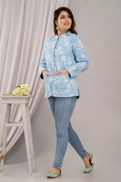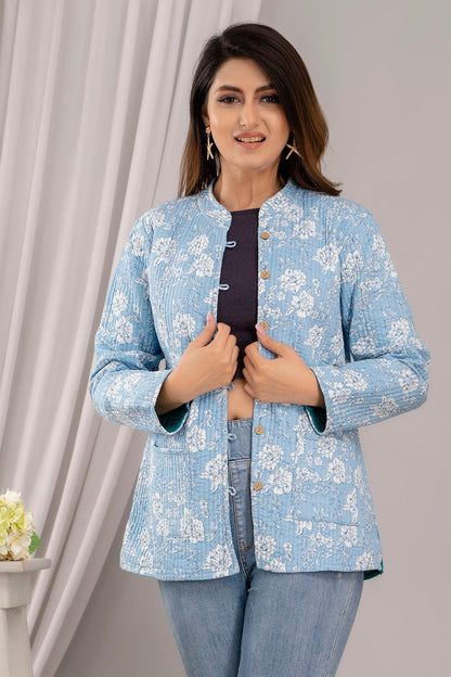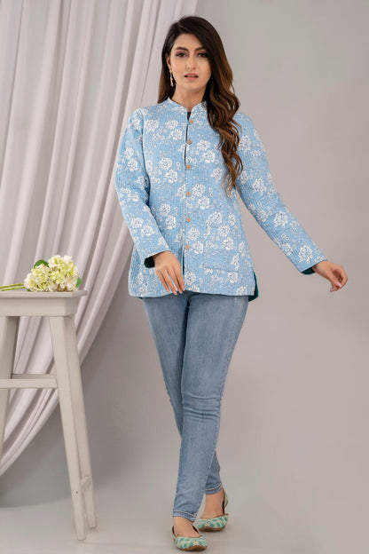 Women Printed Lightweight Cotton Quilted Sky Blue Jacket - SHKL1025