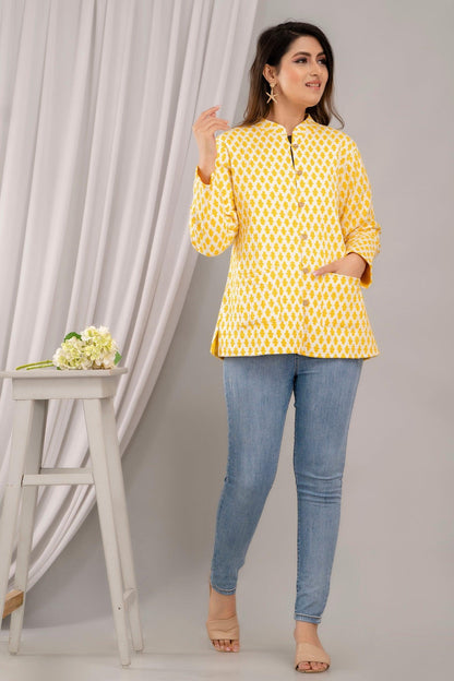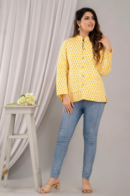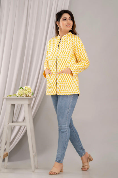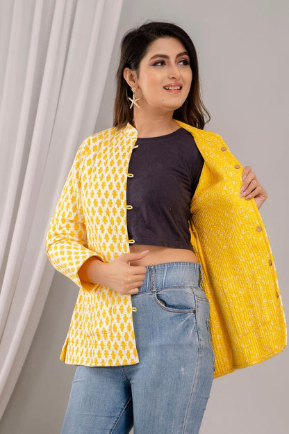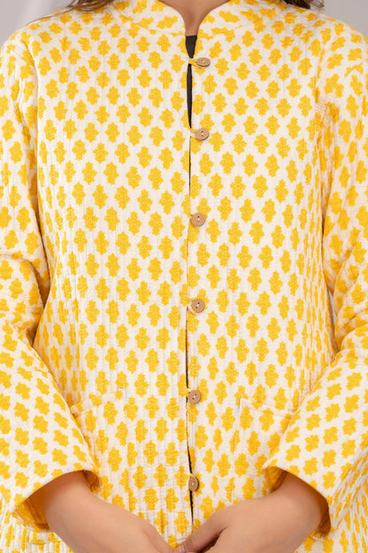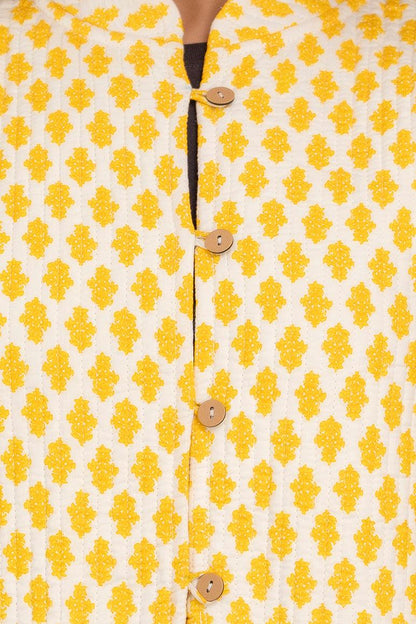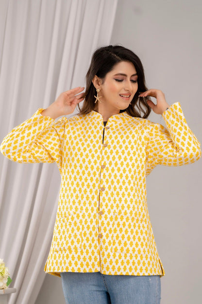Women Printed Lightweight Cotton Quilted Yellow Jacket - SHKL1023