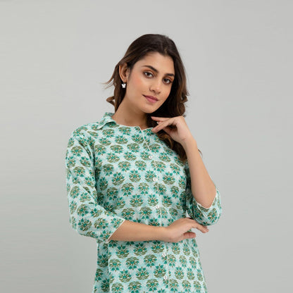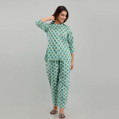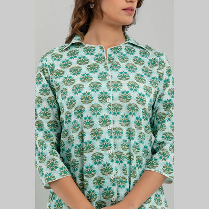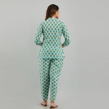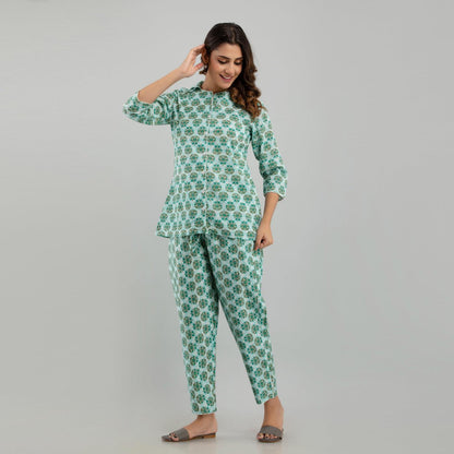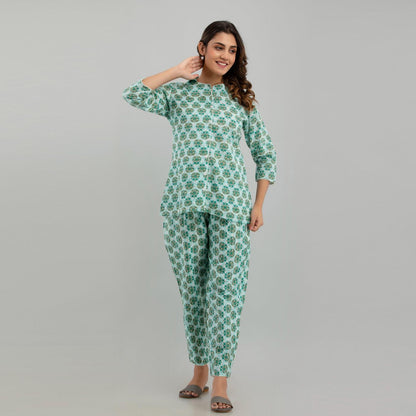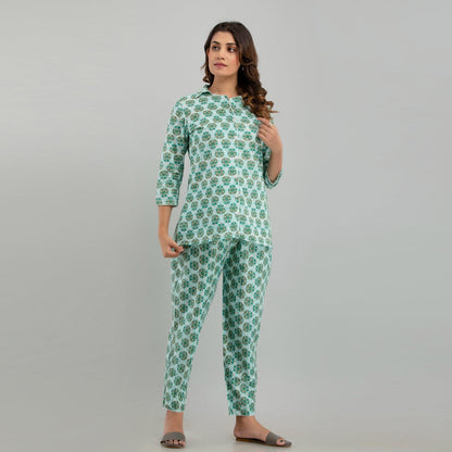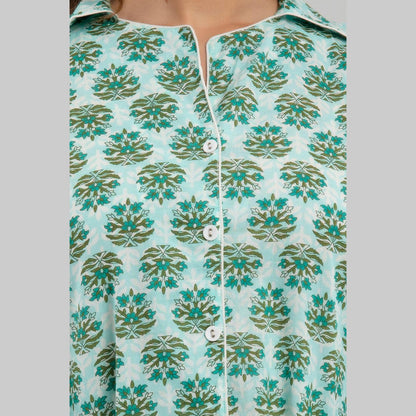 Women Sea Green Cotton Floral Print Night Suit (SHKY1004)