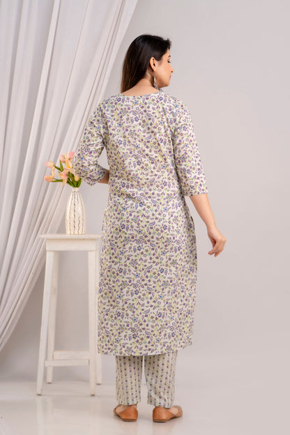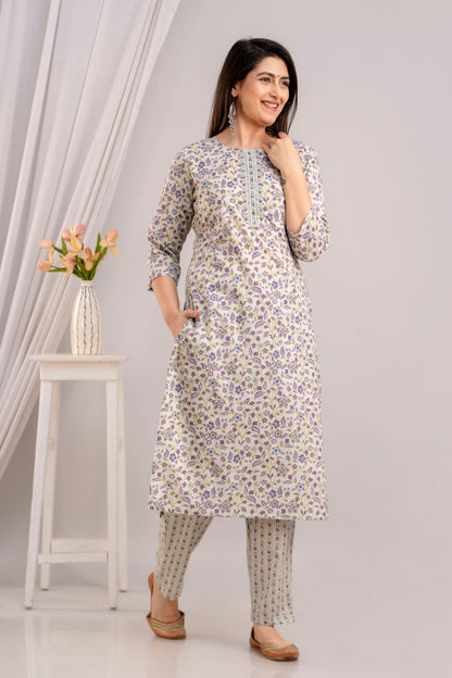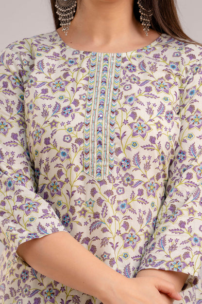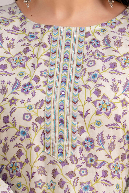 White & Purple straight calf length floral printed kurta, has a sequinced work yoke, three-quarter regular sleeves, and straight hem.