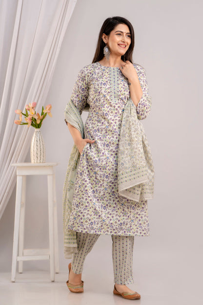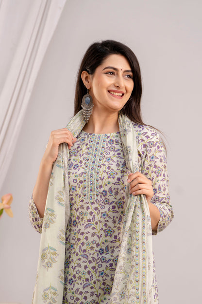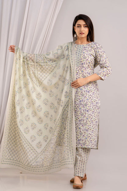 Women White & Purple Floral Printed Kurta with Trousers & Dupatta