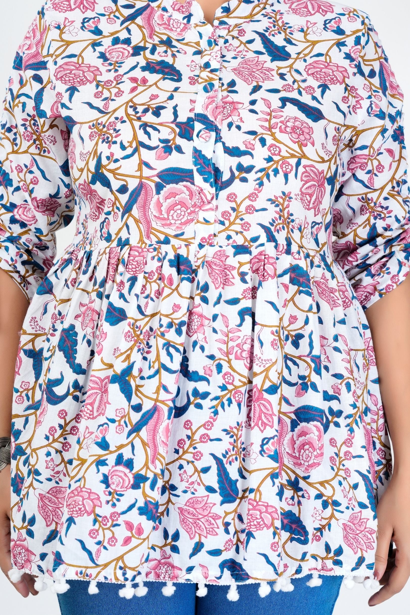 Elevate your everyday style with this charming floral printed peplum top. Crafted from soft cotton, it features a vibrant multicolor floral design on a white base, perfect for both casual and semi-ethnic looks. The 3/4 sleeves with tie-up detail, button-down front, and pom-pom lace hemline add a trendy touch, making it a must-have for your wardrobe. Pair it effortlessly with jeans, leggings, or skirts for a chic and comfortable outfit.